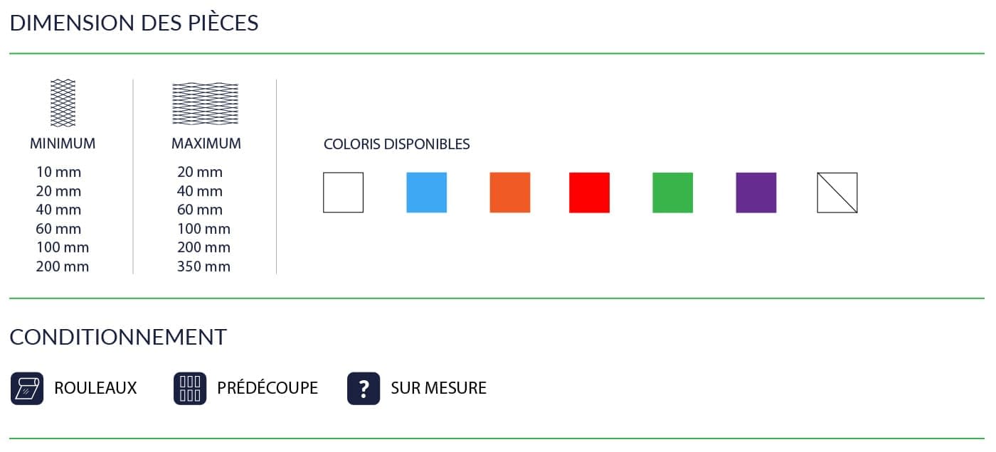 The protective sheaths offered by TAG Plasturgie are available in several sizes, meshes, materials. As well as in a wide range of colors, with the following technical specifications: