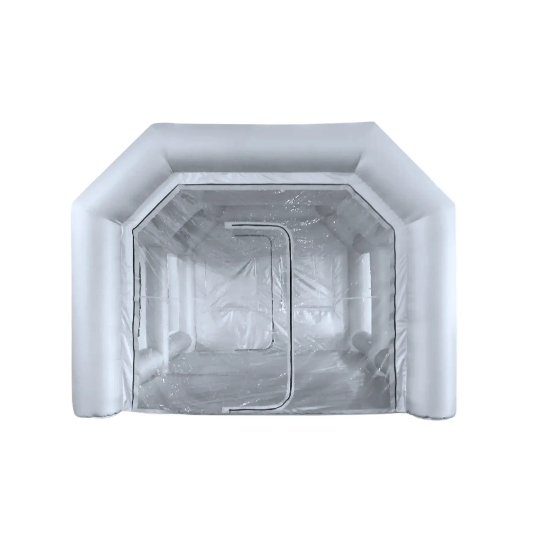 La cabine de peinture gonflable est conçue pour offrir un espace de travail propre, stable et parfaitement lumineux sans éclairage intégré. Sa luminosité provient de larges fenêtres transparentes et d’un tissu clair qui laisse entrer un maximum de lumière naturelle. Cette configuration assure une visibilité homogène et confortable pour contrôler les teintes et les finitions.