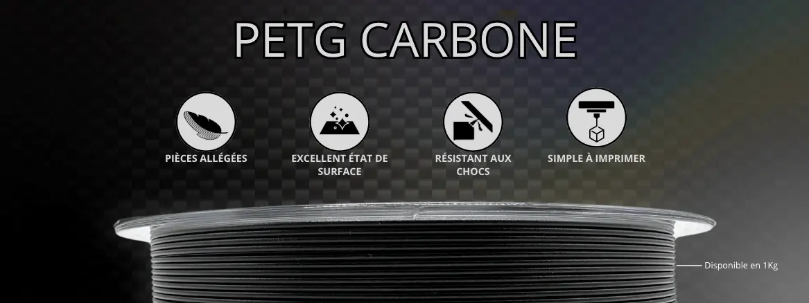Le filament PETG Carbone de TAG in 3D est un filament d'impression 3D de haute qualité, composé de PETG modifié choc de qualité supérieure et de fibres de carbone à haut module de Young. Contrairement à d'autres produits disponibles sur le marché ce filament offre une résistance supérieure grâce à sa structure renforcée en longues fibres de carbone. Il est idéal pour ceux qui recherchent une rigidité structurelle exceptionnelle, une excellente qualité de surface, une stabilité dimensionnelle, un poids léger et une facilité d'impression.