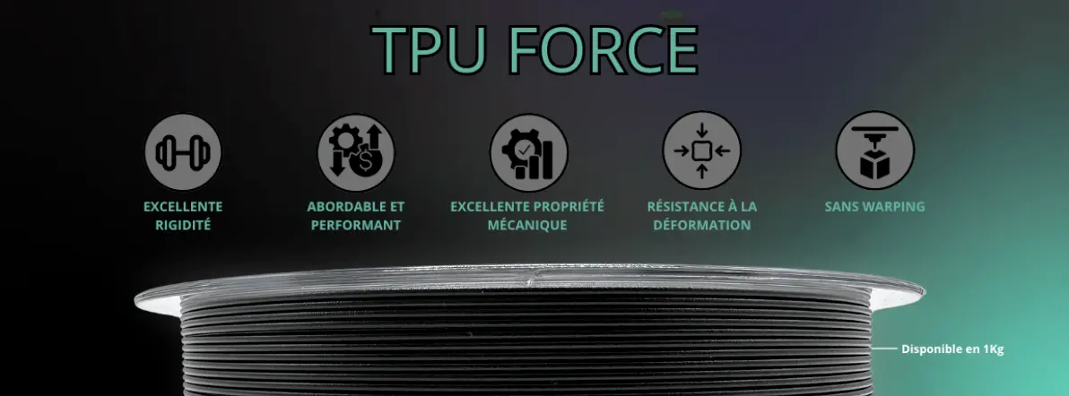 Le TPUFORCE est un TPU 55 Shore D chargé de fibres de verre et de carbone est un matériau composite pour impression 3D qui combine les caractéristiques d'un polyuréthane thermoplastique (TPU) avec les avantages des fibres. Ce filament possède une dureté Shore de 55D, ce qui le rend plus rigide que les TPU classiques, tout en conservant une certaine flexibilité. Les fibres de verre et de carbone intégrées améliorent significativement les performances mécaniques du matériau, notamment la résistance à la traction, la résistance à la flexion et la résistance aux chocs.