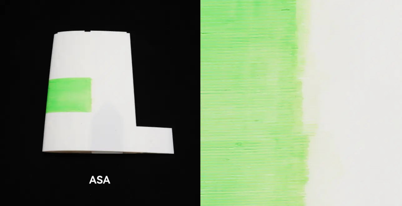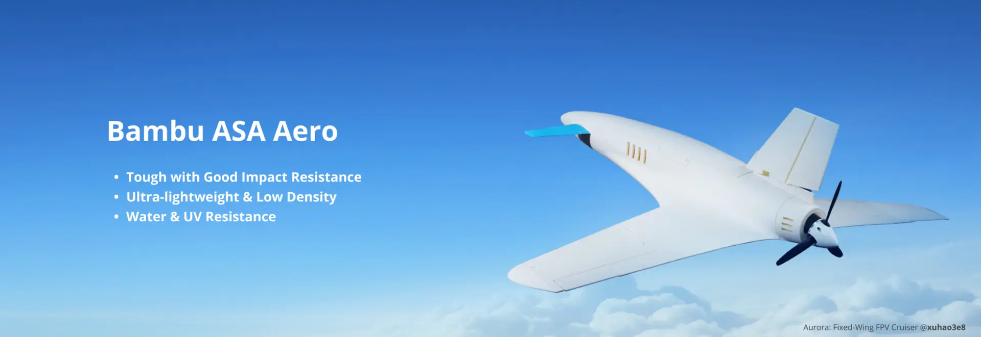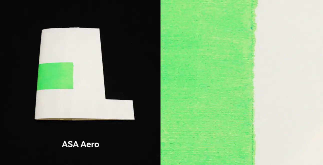 Avec une densité représentant seulement 50 à 75 % de celle des impressions ASA classiques, ASA Aero est aussi léger qu'une plume. Il est conçu pour les objets sensibles au poids, tels que les avions radiocommandés et les véhicules aériens sans pilote (UAV). Grâce à ses caractéristiques de moussage contrôlables, ASA Aero permet d'obtenir des impressions de densité plus faible en augmentant la température d'impression ou en réduisant le débit.