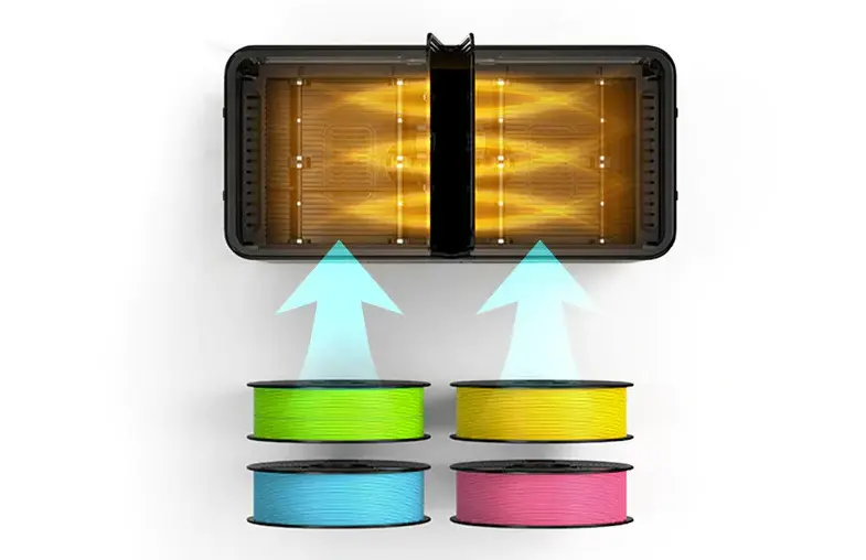 Ses larges capacités de 450 x 210 x 211 mm permettent de traiter 4 bobines de 1 kg de filament à la fois afin de répondre aux besoins d'impression multicolore ou multi-imprimantes.