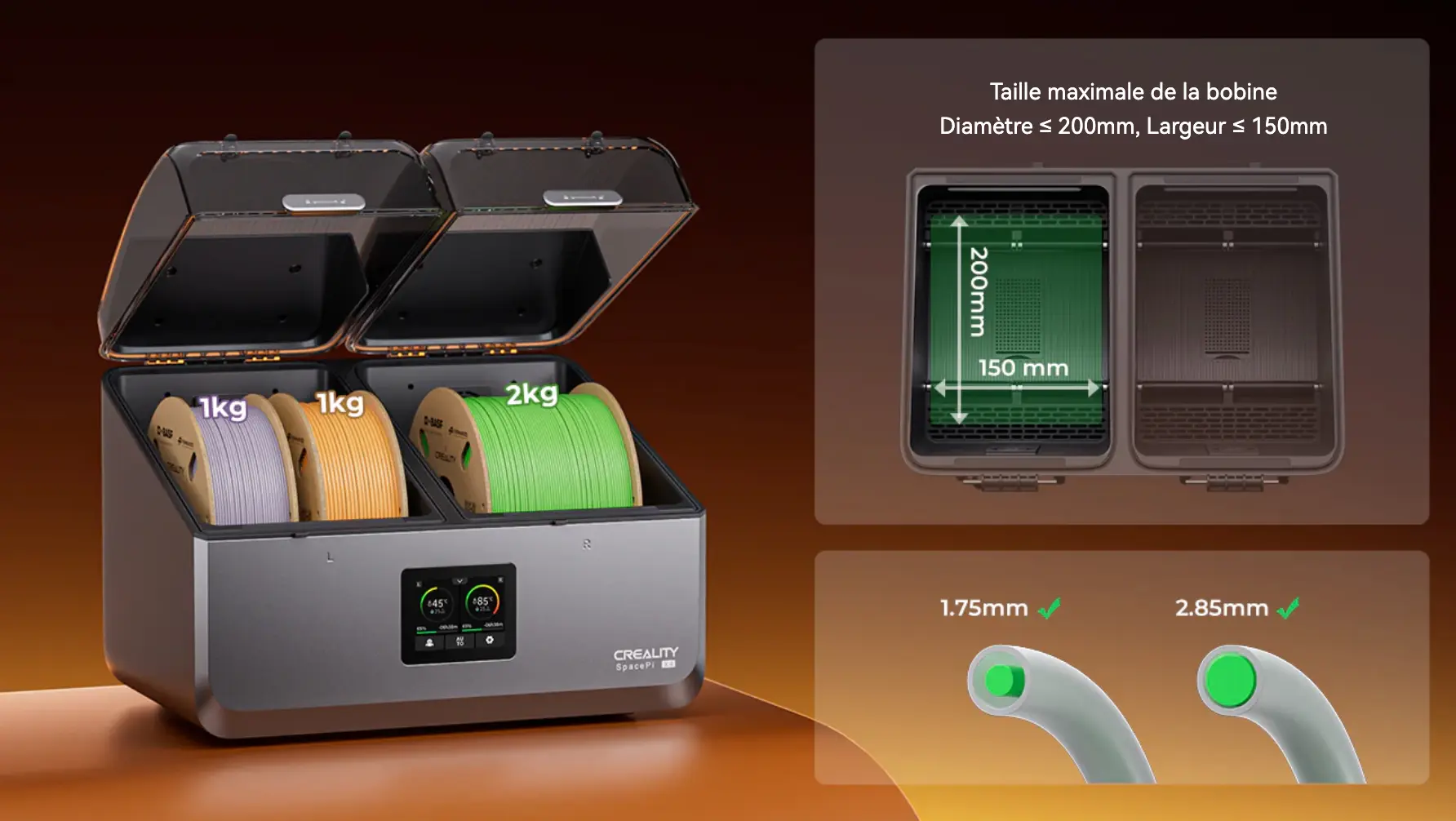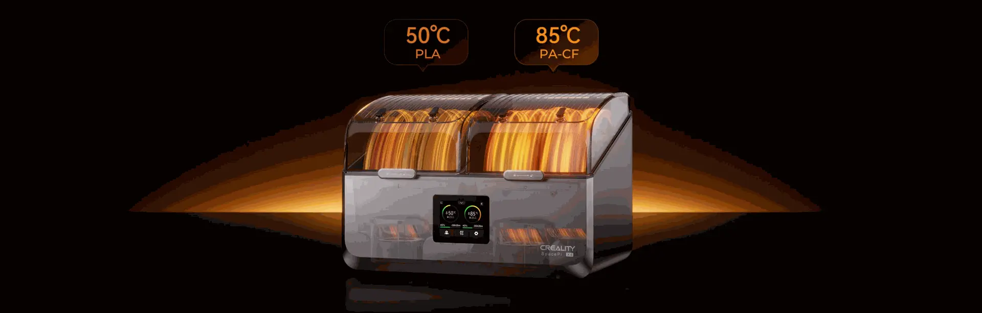 Le Creality SpacePi X4 est une solution de séchage tout-en-un pensée pour les utilisateurs d’imprimantes 3D. Il vous permet de sécher jusqu’à 4 bobines en même temps, avec un système de chauffage PTC double (200W + 200W) capable d’atteindre 85°C.