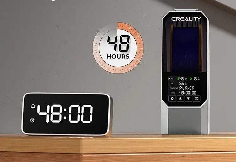 Grâce au minuteur pouvant être réglé entre 0 et 48h et à la température ajustable entre 45 °C et 70 °C, vous pourrez imprimer jusqu'à 12 types de filaments différents.